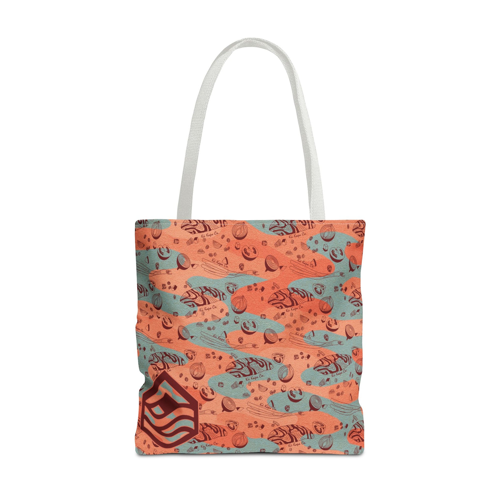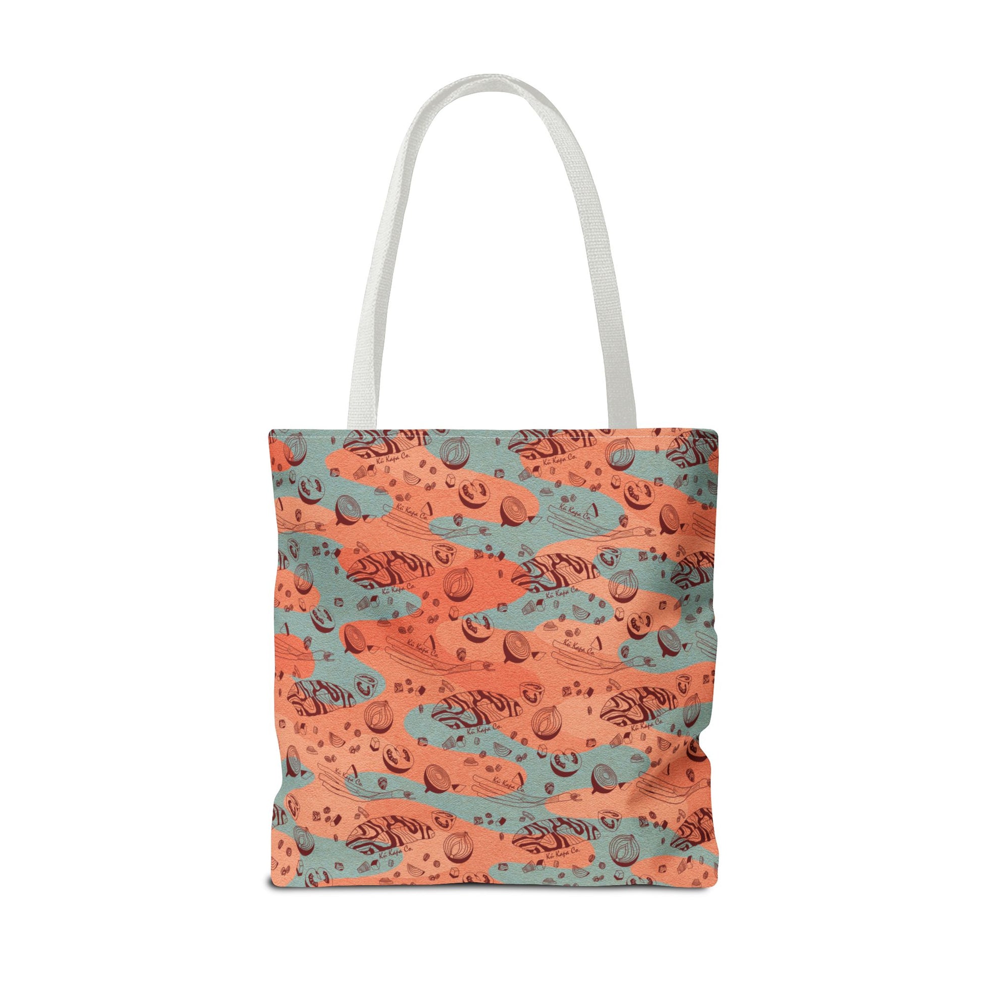 This Tote Bag features a unique design of Lomi salmon with stream camo, giving off a relaxed and outdoorsy vibe.
